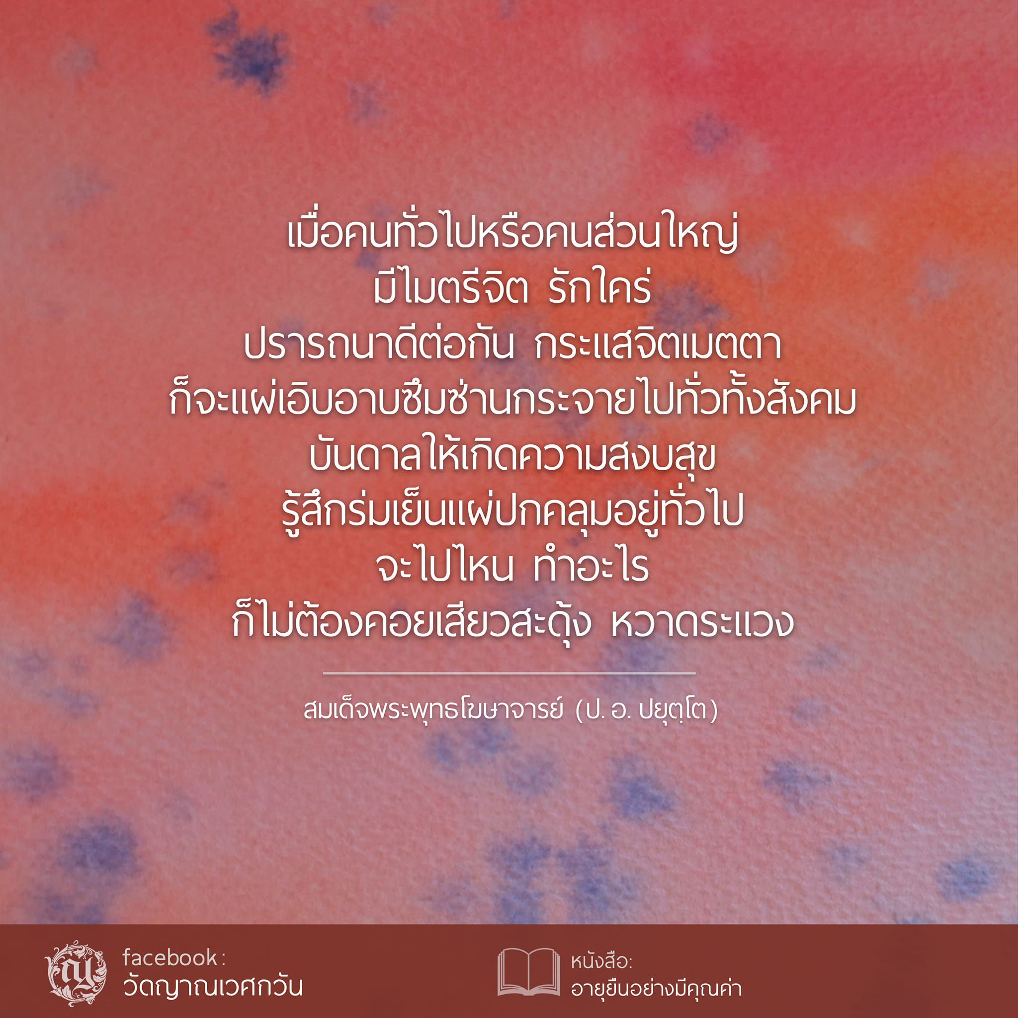 เมื่อคนทั่วไปหรือคนส่วนใหญ่ มีไมตรีจิต รักใคร่ ปรารถนาดีต่อกัน กระแสจิตเมตตาก็จะแผ่เอิบอาบซึมซ่านกระจายไปทั่วทั้งสังคม บันดาลให้เกิดความสงบสุขรู้สึกร่มเย็นแผ่ปกคลุมอยู่ทั่วไป จะไปไหน ทำอะไร ก็ไม่ต้องคอยเสียวสะดุ้ง หวาดระแวง ในสภาพเช่นนี้ ชีวิตด้านกายก็ปลอดภัย จิตใจก็มีสุขภาพสมบูรณ์ นับว่าเป็นสภาพอุดมคติของสังคมที่ทางพระพุทธศาสนาจะชี้แนะให้คนนึกถึง เพื่อกระตุ้นเตือนให้พากันประพฤติธรรม ซึ่งหากเป็นได้เช่นนี้ คนทั้งหลายก็ย่อมจะมีอายุยืนยาวทั่ว