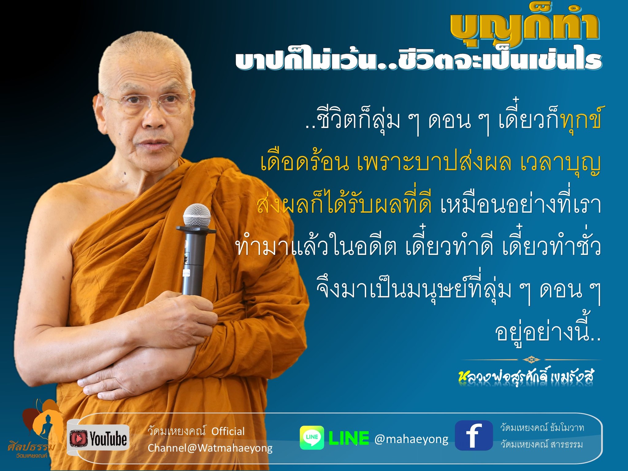 "..ชีวิตก็ลุ่ม ๆ ดอน ๆ เดี๋ยวก็ทุกข์เดือดร้อน เพราะบาปส่งผล เวลาบุญส่งผลก็ได้รับผลที่ดี เหมือนอย่างที่เราทำมาแล้วในอดีต เดี๋ยวทำดี เดี๋ยวทำชั่ว จึงมาเป็นมนุษย์ที่ลุ่ม ๆ ดอน ๆ อยู่อย่างนี้.."