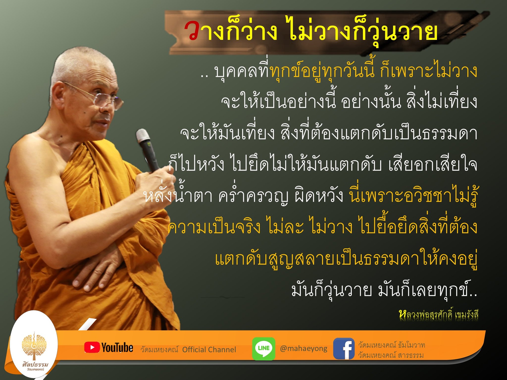 ".. บุคคลที่ทุกข์อยู่ทุกวันนี้ ก็เพราะไม่วาง จะให้เป็นอย่างนี้ อย่างนั้น สิ่งไม่เที่ยง จะให้มันเที่ยง สิ่งที่ต้องแตกดับเป็นธรรมดา ก็ไปหวัง ไปยึดไม่ให้มันแตกดับ เสียอกเสียใจ หลั่งน้ำตา คร่ำครวญ ผิดหวัง นี่เพราะอวิชชาไม่รู้ ความเป็นจริง ไม่ละ ไม่วาง ไปยื้อยึดสิ่งที่ต้อง แตกดับสูญสลายเป็นธรรมดาให้คงอยู่ มันก็วุ่นวาย มันก็เลยทุกข์.."