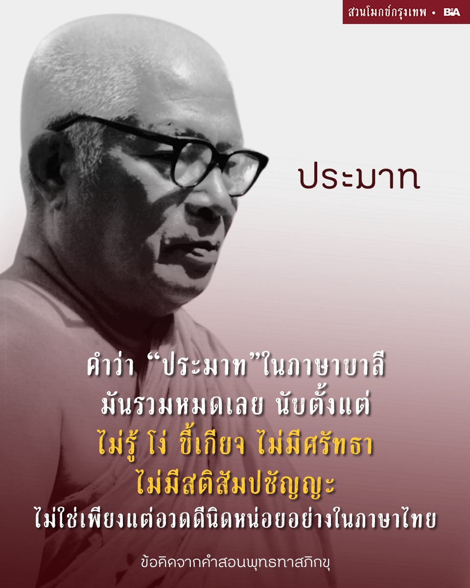 คำว่า “ประมาท” ในภาษาบาลีมันรวมหมดเลย นับตั้งแต่ไม่รู้ โง่ ขี้เกียจ ไม่มีศรัทธา ไม่มีสติสัมปชัญญะ ไม่ใช่ เพียงแต่อวดดีนิดหน่อยอย่างในภาษาไทย