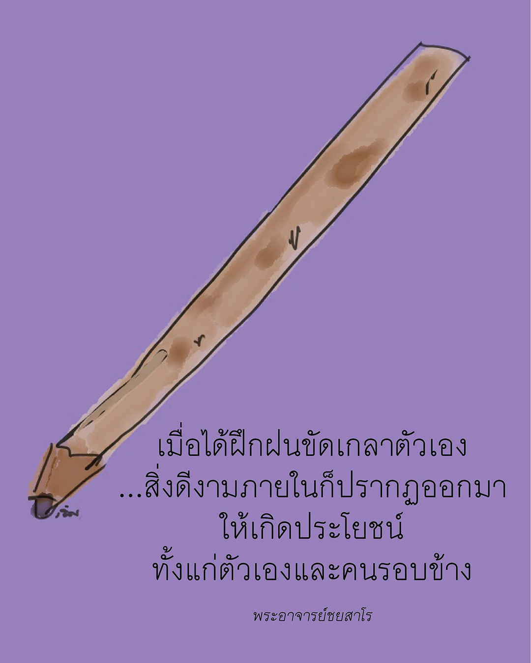 อาจารย์ท่านตั้งใจสอนเราหรือเปล่าว่า เราก็เคยดูถูกตัวเองว่าเป็นคนเก่าๆ แก่ๆ เป็นคนไม่มีคุณธรรมอะไรเลย ดูถูกดูหมิ่นตัวเอง ไม่เป็นเพื่อนกับตัวเอง เมื่อไม่เป็นเพื่อนกับตัวเอง ไม่รักตัวเอง ก็เลยไม่เป็นเพื่อนกับคนอื่นด้วย ไม่รักใครเลย รักแต่หลานคนเดียว พอกลับมาอยู่คนเดียวก็มาคิดพิจารณาว่า อืม...ท่านอาจารย์ก็แค่เอามีดมาแต่งดินสอเก่าๆ นั้นจนเขียนได้อย่างดี เราก็จะทำเหมือนกัน เราจะขัดเกลาสิ่งเก่าๆ ที่เป็นคราบในจิตใจของเรา ไม่แน่ว่าเราอาจจะทำให้ตัวเองดีและมีประโยชน์ เหมือนกับที่ท่านอาจารย์ทำดินสอแท่งนั้นให้ดีก็ได้ จากนั้นยายก็พยายามทำวัตรสวดมนต์ นั่งสมาธิทุกวัน รู้สึกได้ว่าจิตใจยายดีขึ้นๆ แล้วคนนั้นคนนี้ก็มาพูดคุยขอคำปรึกษา ไม่รู้ว่าเขาเห็นอะไรในตัวยาย ยายเคยรู้สึกว่าตัวเองเหมือนดินสอเก่าๆ ที่ไม่น่าใช้เขียนตัวหนังสืองามๆ ได้ แต่เมื่อได้ฝึกฝนขัดเกลาตัวเอง เหมือนท่านอาจารย์เอามีดมาแต่งดินสอ สิ่งดีงามภายในก็ปรากฏออกมาให้เกิดประโยชน์ทั้งแก่ตัวเองและคนรอบข้าง