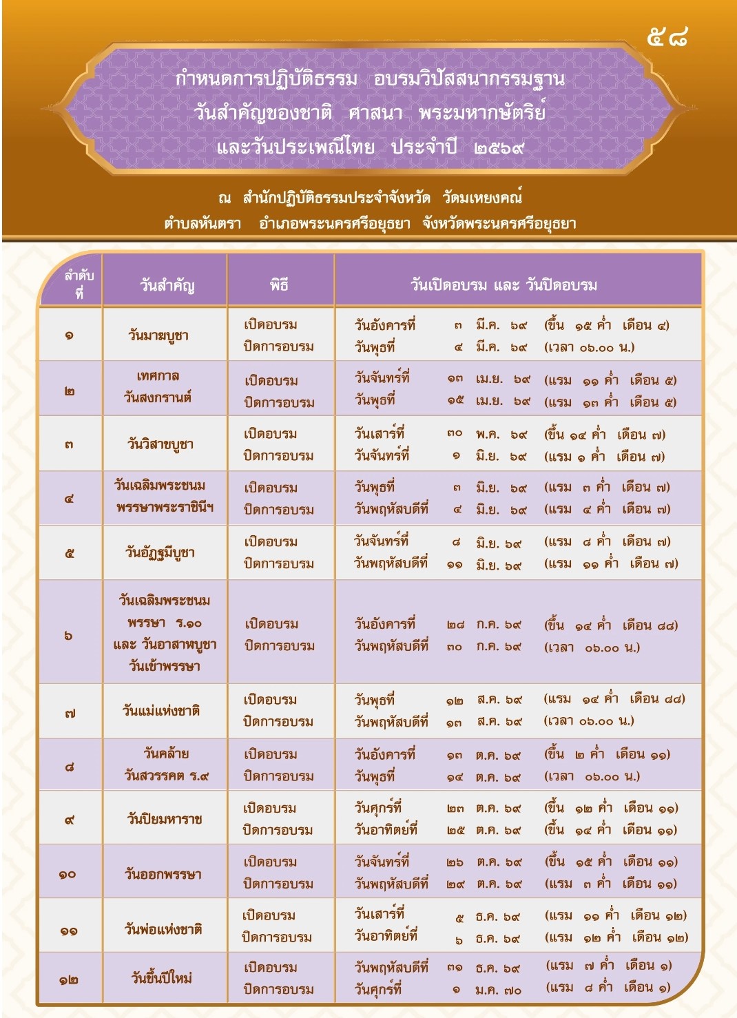 กำหนดการปฏิบัติธรรม อบรมวิปัสสนากรรมฐาน วันสำคัญของชาติ ศาสนา พระมหากษัตริย์ และวันประเพณีไทย ประจำปี 2569 ณ สำนักปฏิบัติธรรมประจำจังหวัด วัดมเหยงคณ์