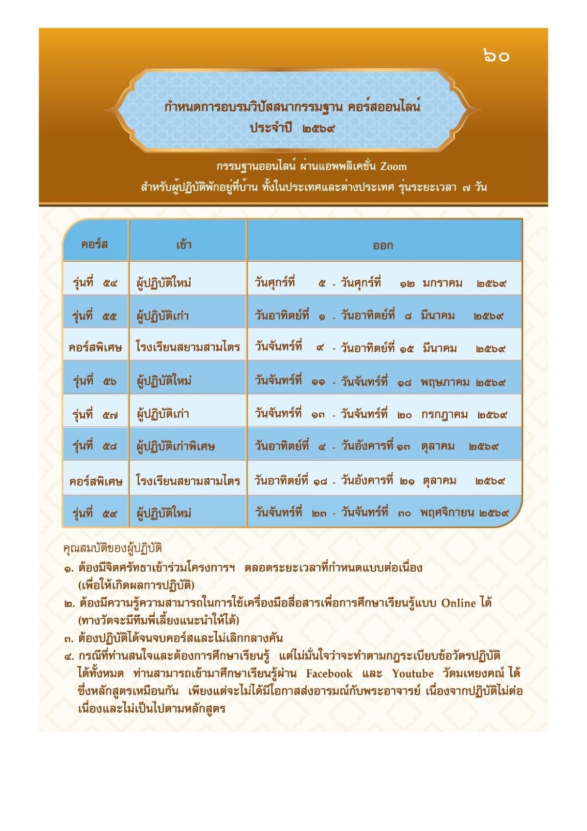 กำหนดการอบรมวิปัสสนากรรมฐาน คอร์สออนไลน์ ประจำปี 2569 กรรมฐานออนไลน์ ผ่านแอพพลิเคชัน Zoom สำหรับผู้ปฏิบัติที่อยู่บ้าน ทั้งในประเทศและต่างประเทศ รุ่นระยะเวลา 7 วัน