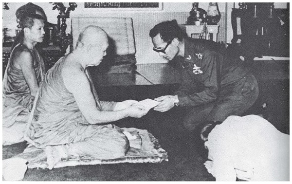 พระบาทสมเด็จพระเจ้าอยู่หัว "นมัสการถามหลวงพ่อฝั้นความสำคัญ ทำอย่างไร ประเทศชาติ ประชาชนจะอยู่ดีกินดี มีความสามัคคีปรองดองกัน"