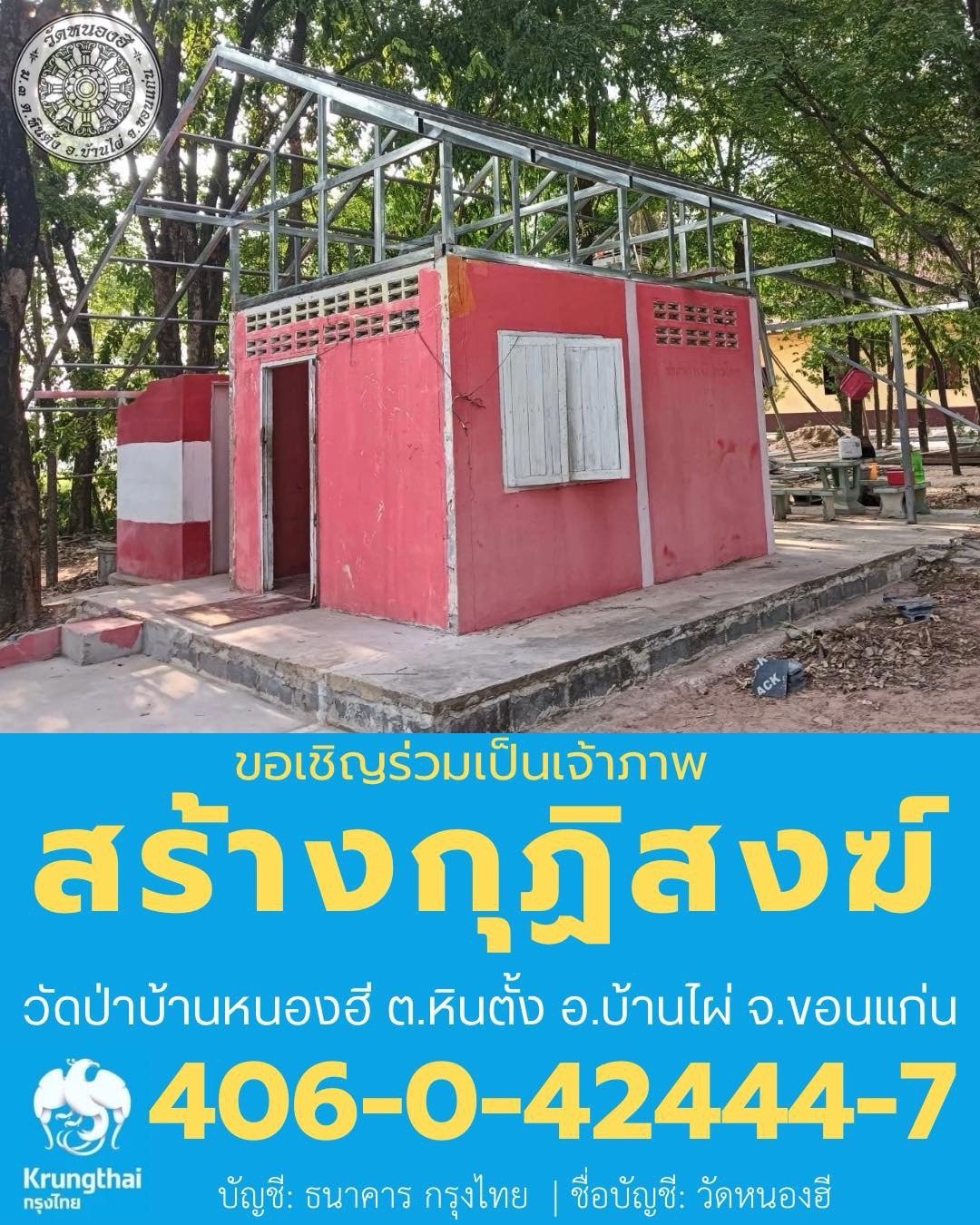 ขอเชิญร่วมบุญสร้างกุฏิสงฆ์ ณ วัดป่าบ้านหนองฮี ต.หินตั้ง อ.บ้านไผ่ จ.ขอนแก่น จึงขอบอกบุญท่านสาธุชนทั้งหลายผู้มีจิตเป็นศรัทธาตั้งมั่นในพระพุทธศาสนา ได้ร่วมทำบุญเป็นเจ้าภาพสร้างกุฏิสงฆ์ในครั้งนี้
