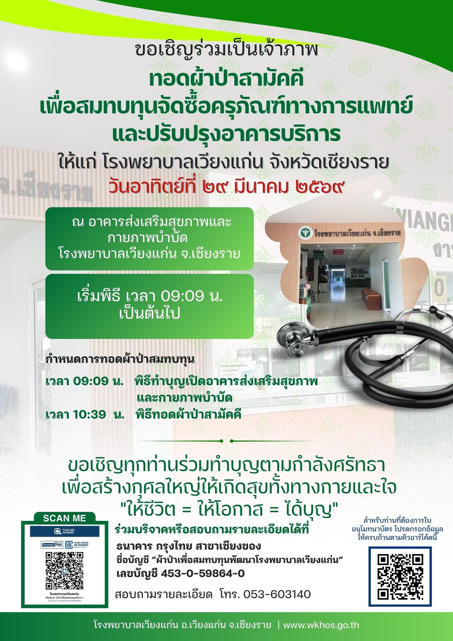 • ขอเชิญร่วมทอดผ้าป่าสมทบทุนซื้อครุภัณฑ์ทางการแพทย์ และปรับปรุงอาคารบริการ รพ.เวียงแก่น จ.เชียงราย 29มีค.69